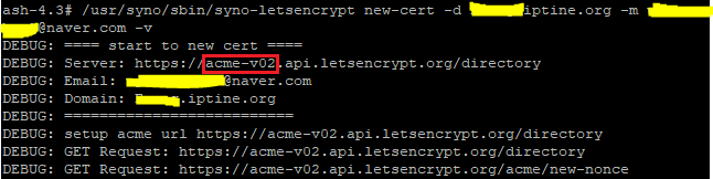 - /usr/syno/sbin/syno-letsencrypt new-cert -d 도메인명 -m 이메일 주소 -v