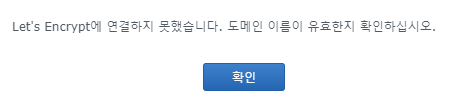 * 만약 보다 정확한 원인(오류 메시지)을 알고 싶다면 putty와 같은 프로그램으로 SSH에 접속하여 /usr/syno/sbin/syno-letsencrypt new-cert -d 도메인명 -m 이메일 주소 -v 명령어를 실행해보면 단계별 오류 메시지를 확인할 수 있다. 하지만 정확한 원인은 여전히 특정할 수 없으므로 참고용으로만 사용하자