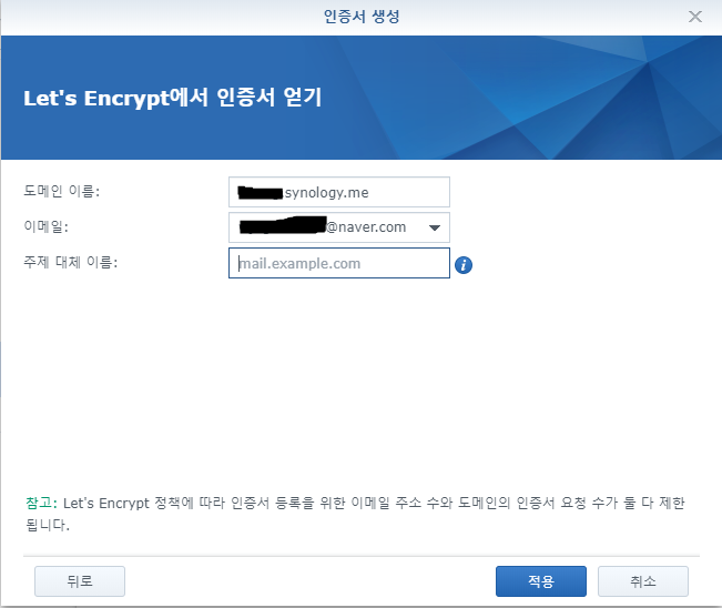 7. DSM에 접속하여 기본 메뉴얼에 따라 Let's Encrypt 인증서를 발급받는다