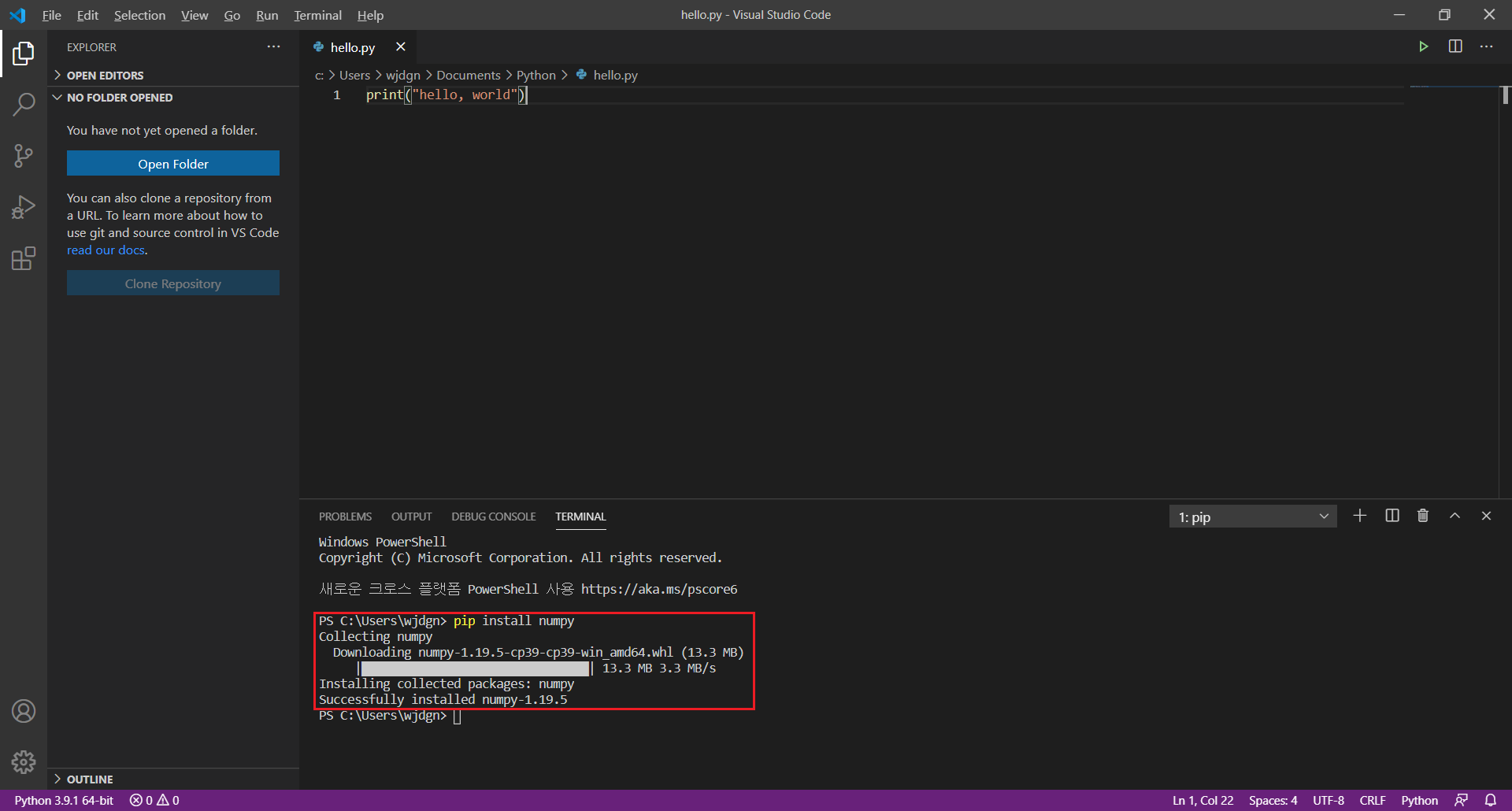 사용법은 콘솔창에서 아래의 pip 명령어를 작성하면 된다. (비쥬얼 스튜디오 코드 콘솔창 기준)